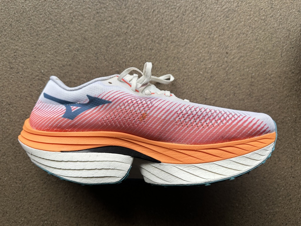 このシューズはミズノが“最上級者向け”として位置づけたモデルです。ミズノもついに厚底シューズを投入したかと思ったら、その大胆な形状に驚かされました。